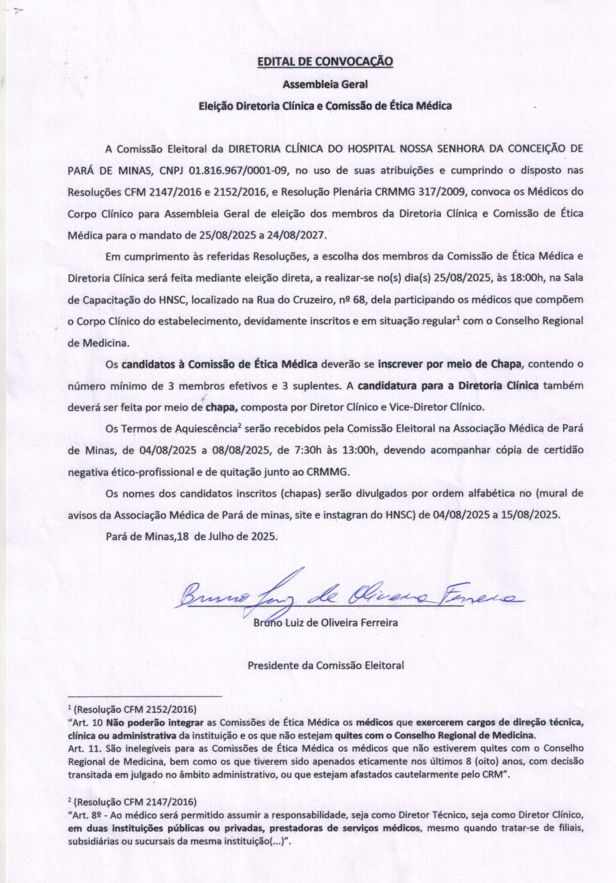 A Comissão Eleitoral da Diretoria Clínica do Hospital Nossa Senhora da Conceição torna público o Edital de Convocação para a Assembleia Geral de eleição dos novos membros da Diretoria Clínica e da Comissão de Ética Médica. O pleito ocorrerá no dia 25 de agosto de 2025, às 18h, na Sala de Capacitação do hospital. Estão aptos a votar e se candidatar os médicos que compõem o Corpo Clínico do HNSC, devidamente inscritos e em situação regular com o CRM.